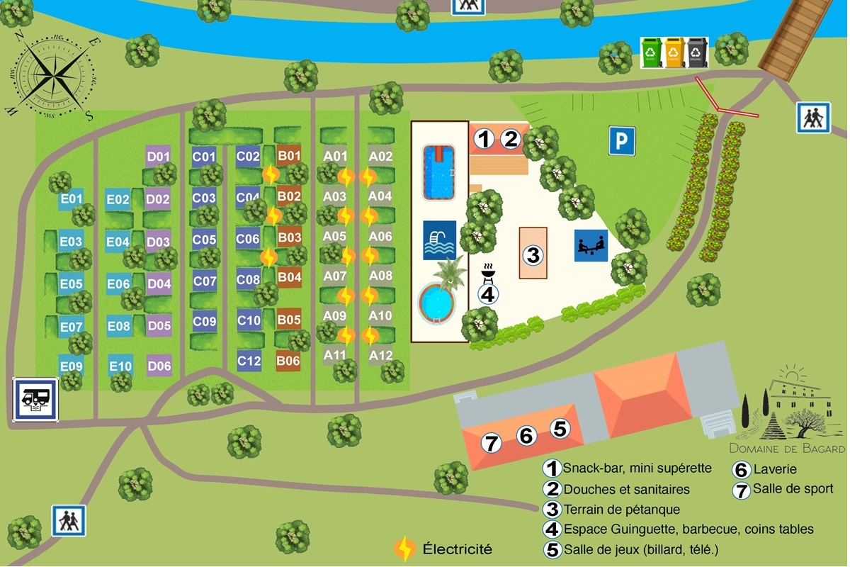 -> 45 emplacements spacieux dont certains ombragés, délimités par de hautes haies végétalisées garantissant intimité et tranquillité, parfaitement adaptés aux fourgons aménagés et camping-cars y compris XXL. Services sur place : eau potable (rechargement), vidange des eaux grises et noires (aire de service réservée aux résidents), électricité en option, douches, toilettes, piscine, laverie automatique. Wifi gratuit dans les allées A et B ainsi qu’à la piscine-guinguette.